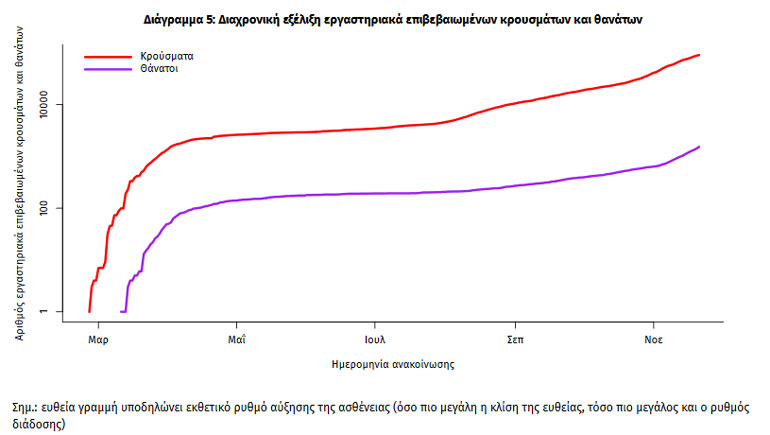 Η διαχρονική εξέλιξη των συνολικών κρουσμάτων και συνολικού αριθμού των θανάτων ασθενών COVID-19 παρουσιάζεται στο ακόλουθο διάγραμμα (σε λογαριθμική κλίμακα).