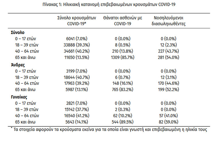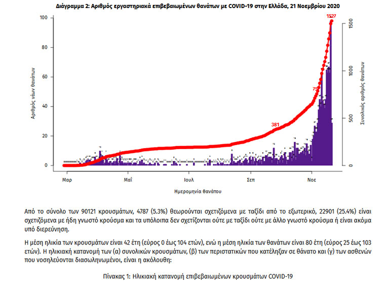 Τέλος, έχουμε 108 ακόμα καταγεγραμμένους θανάτους και 1527 θανάτους συνολικά στη χώρα. 608 (39.8%) γυναίκες και οι υπόλοιποι άνδρες. Η διάμεση ηλικία των θανόντων συμπολιτών μας ήταν τα 80 έτη και το 97.1% είχε κάποιο υποκείμενο νόσημα ή/και ηλικία 70 ετών και άνω».
