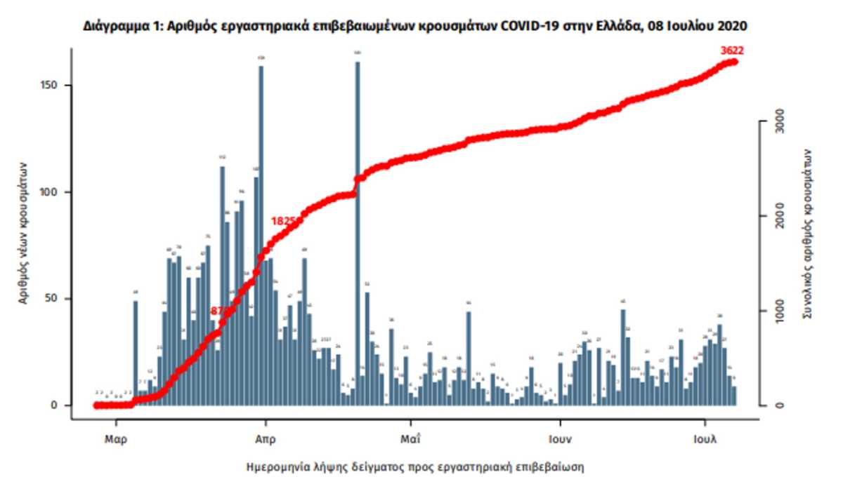 Τα στοιχεία που παρουσιάζονται αφορούν περιστατικά από την επιδημιολογική επιτήρηση της νόσου από τον νέο κορωνοϊό (COVID-19), με βάση τα δεδομένα που έχουν δηλωθεί στον ΕΟΔΥ και καταγραφεί μέχρι τις 08 Ιουλίου 2020 (ώρα 15:00).