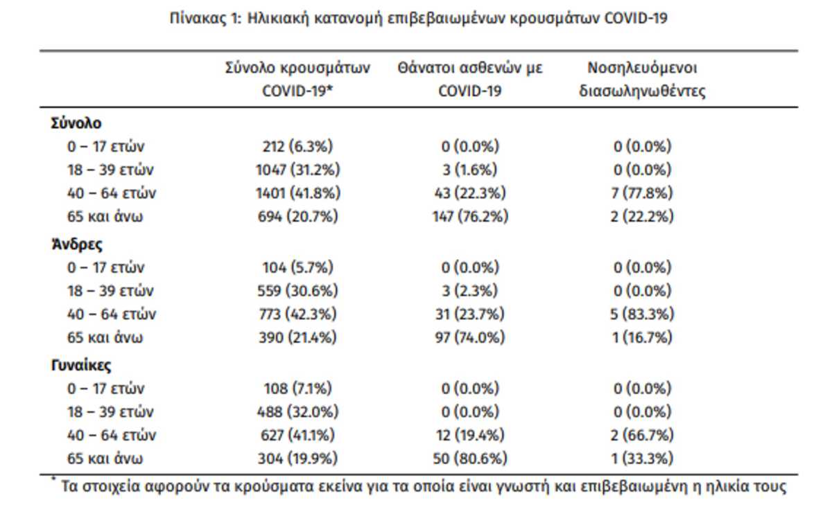 Η μέση ηλικία των κρουσμάτων είναι 47 έτη (εύρος 0 έως 102 ετών), ενώ η μέση ηλικία των θανάτων είναι 76 έτη (εύρος 35 έως 102 ετών). Η ηλικιακή κατανομή των (α) συνολικών κρουσμάτων, (β) των περιστατικών που κατέληξαν σε θάνατο και (γ) των ασθενών που νοσηλεύονται διασωληνωμένοι, είναι η ακόλουθη: