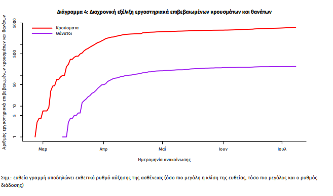 Η διαχρονική εξέλιξη των συνολικών κρουσμάτων και συνολικού αριθμού των θανάτων ασθενών COVID-19 παρουσιάζεται στο ακόλουθο διάγραμμα (σε λογαριθμική κλίμακα).