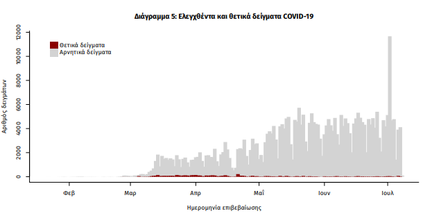 Δείγματα που έχουν ελεγχθεί στα συνεργαζόμενα με τον ΕΟΔΥ εργαστήρια: Από την 1η Ιανουαρίου 2020 μέχρι σήμερα, στα εργαστήρια που διενεργούν ελέγχους για τον νέο κορωνοϊό (SARS-CoV-2) και που δηλώνουν συστηματικά στον ΕΟΔΥ το σύνολο των δειγμάτων που ελέγχουν (θετικά και αρνητικά), έχουν συνολικά ελεγχθεί 355190 κλινικά δείγματα, εκ των οποίων τα 5786 (1.6%) ήταν θετικά στον κορωνοϊό (συμπεριλαμβάνονται και περισσότερα από ένα δείγματα ανά άτομο που ελέγχθηκε).