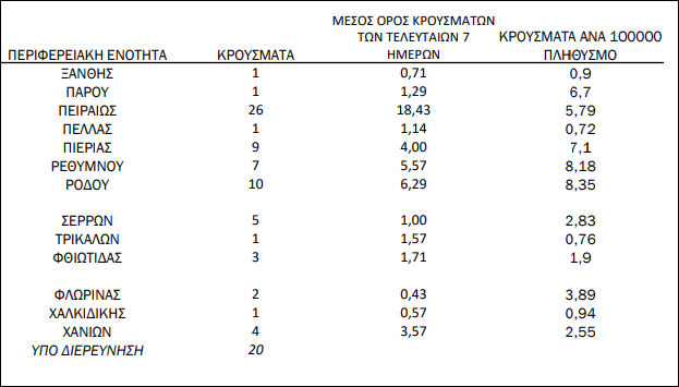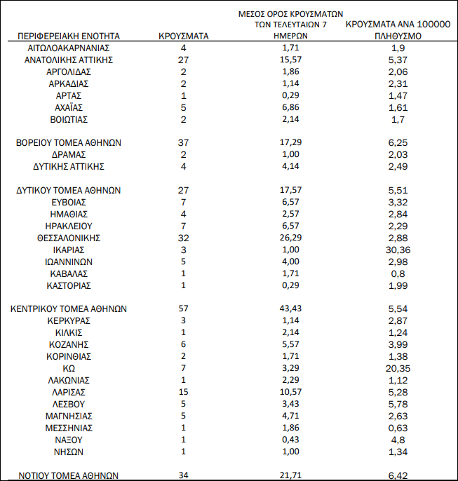 Από τα 406 κρούσματα, τα 213 βρέθηκαν στην Αττική, τα 32 στη Θεσσαλονίκη και σε κάθε περιφέρεια εντοπίστηκαν ως εξής: