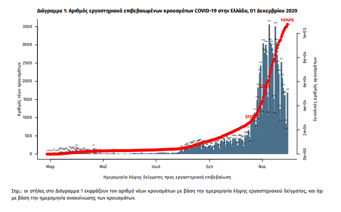 Τα στοιχεία που παρουσιάζονται αφορούν περιστατικά από την επιδημιολογική επιτήρηση της νόσου από το νέο κορωνοϊό (COVID19), με βάση τα δεδομένα που έχουν δηλωθεί στον ΕΟΔΥ και καταγραφεί μέχρι τις 01 Δεκεμβρίου 2020 (ώρα 15:00). Τα νέα εργαστηριακά επιβεβαιωμένα κρούσματα της νόσου είναι 2199, εκ των οποίων 25 εντοπίστηκαν κατόπιν ελέγχων στις πύλες εισόδου της χώρας. Ο συνολικός αριθμός των κρουσμάτων ανέρχεται σε 107470 (ημερήσια μεταβολή +2.1%), εκ των οποίων 52.9% άνδρες. Οι νέοι θάνατοι ασθενών με COVID-19 είναι 111, ενώ από την έναρξη της επιδημίας έχουν καταγραφεί συνολικά 2517 θάνατοι.Η διάμεση ηλικία των ασθενών που απεβίωσαν είναι 80 έτη. Ο αριθμός των ασθενών που νοσηλεύονται διασωληνωμένοι είναι 596 (72.0% άνδρες). Η ημερήσια κατανομή των επιβ