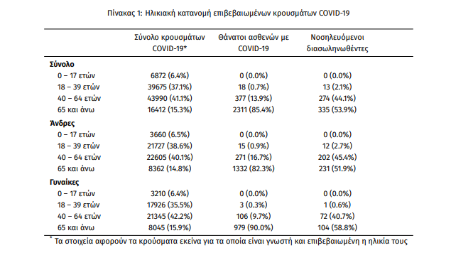 Τέλος, έχουμε 100 ακόμα καταγεγραμμένους θανάτους και 2706 θανάτους συνολικά στη χώρα. 1085 (40.1%) γυναίκες και οι υπόλοιποι άνδρες. Η διάμεση ηλικία των θανόντων συμπολιτών μας ήταν τα 80 έτη και το 96.5% είχε κάποιο υποκείμενο νόσημα ή/και ηλικία 70 ετών και άνω.