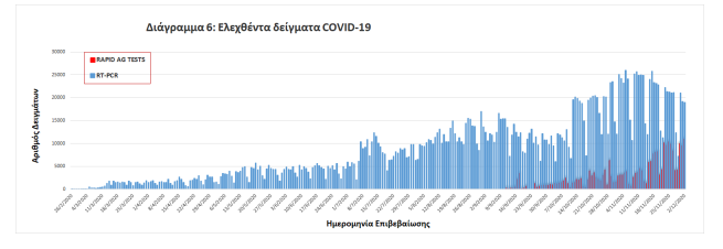 Δείγματα που έχουν ελεγχθεί: Από την 1η Ιανουαρίου 2020 μέχρι σήμερα, στα εργαστήρια που διενεργούν ελέγχους για τον νέο κορωνοϊό (SARS-CoV-2) και που δηλώνουν συστηματικά στον ΕΟΔΥ το σύνολο των δειγμάτων που ελέγχουν, έχουν συνολικά ελεγχθεί 2432614 κλινικά δείγματα ενώ από Μονάδες Υγείας και Κλιμάκια του ΕΟΔΥ που διενεργούν ελέγχους Rapid Ag έχουν ελεγχθεί 243348 δείγματα.