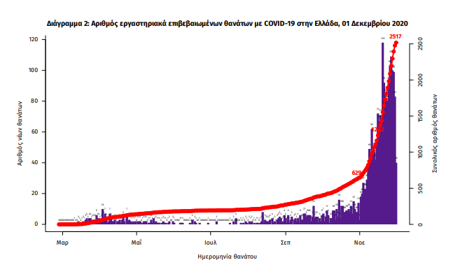 Τα στοιχεία που παρουσιάζονται αφορούν περιστατικά από την επιδημιολογική επιτήρηση της νόσου από το νέο κορωνοϊό (COVID19), με βάση τα δεδομένα που έχουν δηλωθεί στον ΕΟΔΥ και καταγραφεί μέχρι τις 01 Δεκεμβρίου 2020 (ώρα 15:00). Τα νέα εργαστηριακά επιβεβαιωμένα κρούσματα της νόσου είναι 2199, εκ των οποίων 25 εντοπίστηκαν κατόπιν ελέγχων στις πύλες εισόδου της χώρας. Ο συνολικός αριθμός των κρουσμάτων ανέρχεται σε 107470 (ημερήσια μεταβολή +2.1%), εκ των οποίων 52.9% άνδρες. Οι νέοι θάνατοι ασθενών με COVID-19 είναι 111, ενώ από την έναρξη της επιδημίας έχουν καταγραφεί συνολικά 2517 θάνατοι.Η διάμεση ηλικία των ασθενών που απεβίωσαν είναι 80 έτη. Ο αριθμός των ασθενών που νοσηλεύονται διασωληνωμένοι είναι 596 (72.0% άνδρες). Η ημερήσια κατανομή των επιβ
