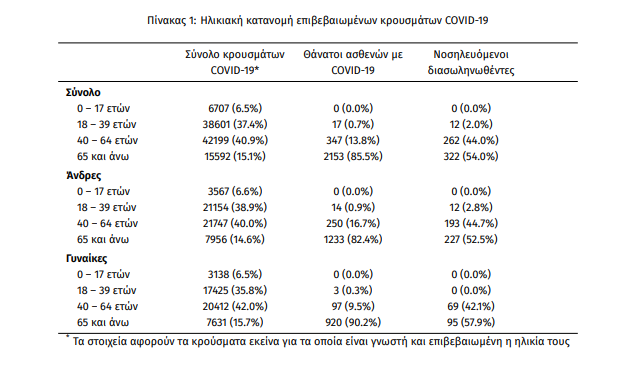Τέλος, έχουμε 111 ακόμα καταγεγραμμένους θανάτους και 2517 θανάτους συνολικά στη χώρα. 1021 (40.6%) γυναίκες και οι υπόλοιποι άνδρες. Η διάμεση ηλικία των θανόντων συμπολιτών μας ήταν τα 80 έτη και το 96.6% είχε κάποιο υποκείμενο νόσημα ή/και ηλικία 70 ετών και άνω.