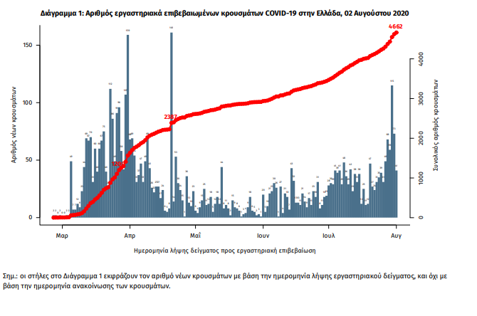 Τα στοιχεία που παρουσιάζονται αφορούν περιστατικά από την επιδημιολογική επιτήρηση της νόσου από το νέο κορωνοϊό (COVID19), με βάση τα δεδομένα που έχουν δηλωθεί στον ΕΟΔΥ και καταγραφεί μέχρι τις 02 Αυγούστου 2020 (ώρα 15:00). Τα νέα εργαστηριακά επιβεβαιωμένα κρούσματα της νόσου είναι 75, εκ των οποίων τα 4 εντοπίστηκαν κατόπιν ελέγχων στις πύλες εισόδου της χώρας. Ο συνολικός αριθμός των κρουσμάτων ανέρχεται σε 4662 (ημερήσια μεταβολή +1.6%), εκ των οποίων 54.7% άνδρες. Οι νέοι θάνατοι ασθενών με COVID-19 είναι 2, ενώ από την έναρξη της επιδημίας έχουν καταγραφεί συνολικά 208 θάνατοι. Η μέση ηλικία των ασθενών που απεβίωσαν είναι 76 έτη. Ο αριθμός των ασθενών που νοσηλεύονται διασωληνωμένοι είναι 12 (83.3% άνδρες). Η ημερήσια κατανομή των επιβεβαιωμένων κρουσμάτων είναι η ακόλουθη (η γραμμή παριστάνει την συνολική, αθροιστική κατανομή των κρουσμάτων).