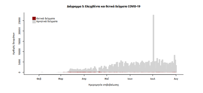 Δείγματα που έχουν ελεγχθεί στα συνεργαζόμενα με τον ΕΟΔΥ εργαστήρια: Από την 1η Ιανουαρίου 2020 μέχρι σήμερα, στα εργαστήρια που διενεργούν ελέγχους για τον νέο κορωνοϊό (SARS-CoV-2) και που δηλώνουν συστηματικά στον ΕΟΔΥ το σύνολο των δειγμάτων που ελέγχουν (θετικά και αρνητικά), έχουν συνολικά ελεγχθεί 545439 κλινικά δείγματα, εκ των οποίων τα 6657 (1.4%) ήταν θετικά στον κορωνοϊό (συμπεριλαμβάνονται και περισσότερα από ένα δείγματα ανά άτομο που ελέγχθηκε).
