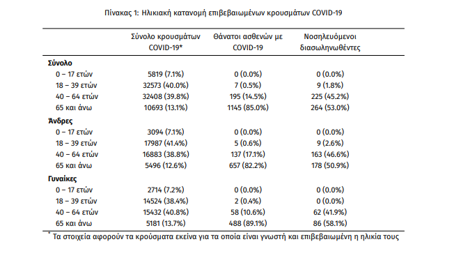 Τέλος, έχουμε 59 ακόμα καταγεγραμμένους θανάτους και 1347 θανάτους συνολικά στη χώρα. 547 (40.6%) γυναίκες και οι υπόλοιποι άνδρες. Η διάμεση ηλικία των θανόντων συμπολιτών μας ήταν τα 80 έτη και το 97.2% είχε κάποιο υποκείμενο νόσημα ή/και ηλικία 70 ετών και άνω.