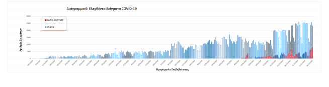 Δείγματα που έχουν ελεγχθεί: Από την 1η Ιανουαρίου 2020 μέχρι σήμερα, στα εργαστήρια που διενεργούν ελέγχους για τον νέο κορωνοϊό (SARS-CoV-2) και που δηλώνουν συστηματικά στον ΕΟΔΥ το σύνολο των δειγμάτων που ελέγχουν, έχουν συνολικά ελεγχθεί 2177279 κλινικά δείγματα ενώ από Μονάδες Υγείας και Κλιμάκια του ΕΟΔΥ που διενεργούν ελέγχους Rapid Ag έχουν ελεγχθεί 133255 δείγματα.