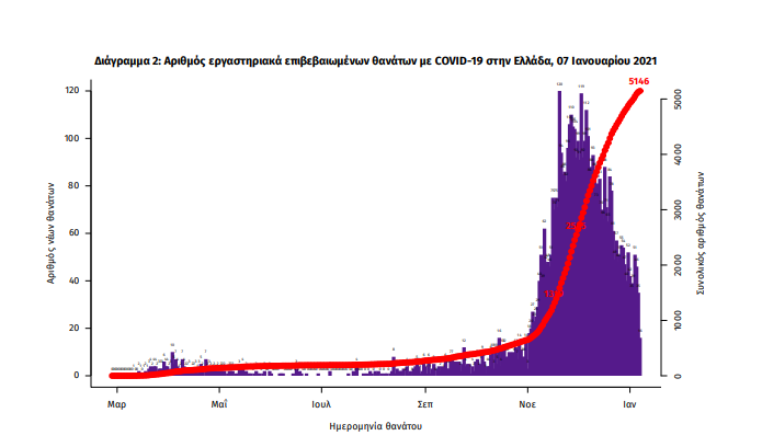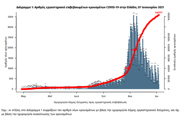Τα στοιχεία που παρουσιάζονται αφορούν περιστατικά από την επιδημιολογική επιτήρηση της νόσου από το νέο κορωνοϊό (COVID19), με βάση τα δεδομένα που έχουν δηλωθεί στον ΕΟΔΥ και καταγραφεί μέχρι τις 07 Ιανουαρίου 2021 (ώρα 15:00). Τα νέα εργαστηριακά επιβεβαιωμένα κρούσματα της νόσου είναι 510, εκ των οποίων 16 εντοπίστηκαν κατόπιν ελέγχων στις πύλες εισόδου της χώρας. Ο συνολικός αριθμός των κρουσμάτων ανέρχεται σε 142777 (ημερήσια μεταβολή +0.4%), εκ των οποίων 52.3% άνδρες. Οι νέοι θάνατοι ασθενών με COVID-19 είναι 47, ενώ από την έναρξη της επιδημίας έχουν καταγραφεί συνολικά 5146 θάνατοι. Η διάμεση ηλικία των ασθενών που απεβίωσαν είναι 79 έτη. Ο αριθμός των ασθενών που νοσηλεύονται διασωληνωμένοι είναι 391 (68.0% άνδρες). Η ημερήσια κατανομή των επιβεβαιωμένων κρουσμάτων είναι η ακόλουθη (η γραμμή παριστάνει την συνολική, αθροιστική κατανομή των κρουσμάτων).