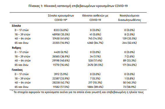 Τέλος, έχουμε 47 νέους θανάτους από τη νόσο COVID-19, φθάνοντας τους 5146 θανάτους συνολικά στη χώρα, εκ των οποίων 3041 (59.1%) άνδρες. Η διάμεση ηλικία των θανόντων συμπολιτών μας ήταν τα 79 έτη και το 95.5% είχε κάποιο υποκείμενο νόσημα ή/και ηλικία 70 ετών και άνω.