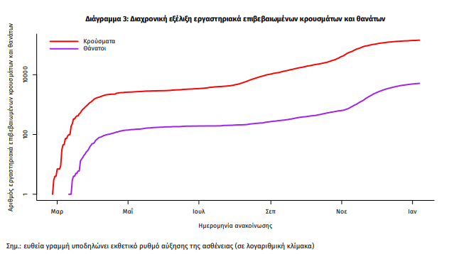 Η διαχρονική εξέλιξη των συνολικών κρουσμάτων και συνολικού αριθμού των θανάτων ασθενών COVID-19 παρουσιάζεται στο ακόλουθο διάγραμμα.