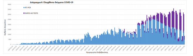Δείγματα που έχουν ελεγχθεί: Από την 1η Ιανουαρίου 2020 μέχρι σήμερα, στα εργαστήρια που διενεργούν ελέγχους για τον νέο κορωνοϊό (SARS-CoV-2) και που δηλώνουν συστηματικά στον ΕΟΔΥ το σύνολο των δειγμάτων που ελέγχουν, έχουν συνολικά ελεγχθεί 2.859.041 κλινικά δείγματα ενώ από Μονάδες Υγείας και Κλιμάκια του ΕΟΔΥ που διενεργούν ελέγχους Rapid Ag έχουν ελεγχθεί 644.649 δείγματα.