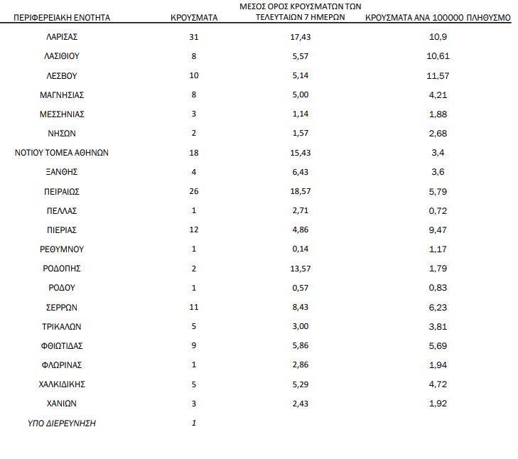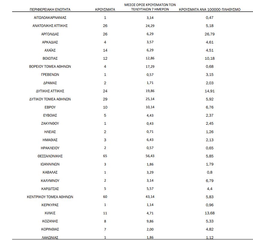 Από το σύνολο των 510 νέων κρουσμάτων του νέου ιού στη χώρα 18 είναι εισαγόμενα και 16 εντοπίστηκαν κατόπιν ελέγχων στις πύλες εισόδου της χώρας. Η κατανομή των 492 νέων εγχώριων κρουσμάτων ανά Περιφερειακή Ενότητα παρουσιάζεται στον κατωτέρω πίνακα.