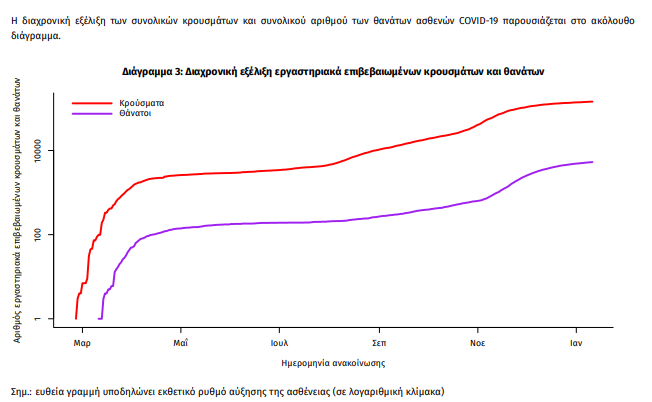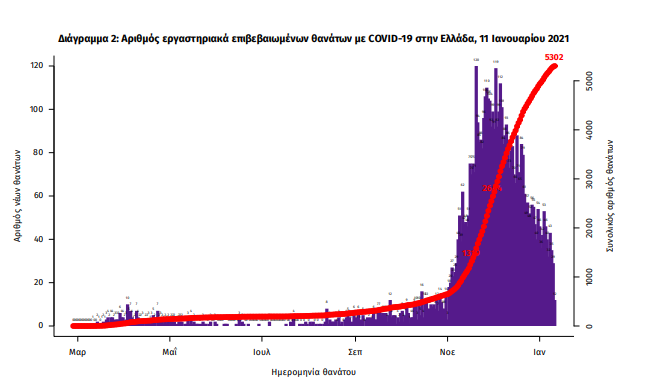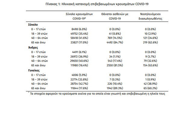 Τέλος, έχουμε 39 νέους θανάτους από τη νόσο COVID-19, φθάνοντας τους 5302 θανάτους συνολικά στη χώρα, εκ των οποίων 3130 (59.0%) άνδρες. Η διάμεση ηλικία των θανόντων συμπολιτών μας ήταν τα 79 έτη και το 95.5% είχε κάποιο υποκείμενο νόσημα ή/και ηλικία 70 ετών και άνω.