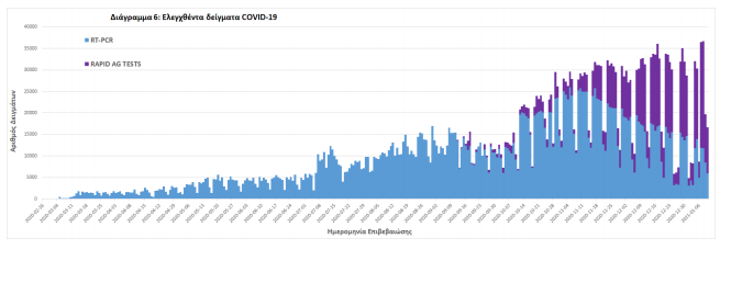 Δείγματα που έχουν ελεγχθεί: Από την 1η Ιανουαρίου 2020 μέχρι σήμερα, στα εργαστήρια που διενεργούν ελέγχους για τον νέο κορωνοϊό (SARS-CoV-2) και που δηλώνουν συστηματικά στον ΕΟΔΥ το σύνολο των δειγμάτων που ελέγχουν, έχουν συνολικά ελεγχθεί 2.897.143 κλινικά δείγματα ενώ από Μονάδες Υγείας και Κλιμάκια του ΕΟΔΥ που διενεργούν ελέγχους Rapid Ag έχουν ελεγχθεί 716.066 δείγματα.