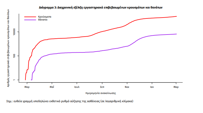 Η διαχρονική εξέλιξη των συνολικών κρουσμάτων και συνολικού αριθμού των θανάτων ασθενών COVID-19 παρουσιάζεται στο ακόλουθο διάγραμμα.