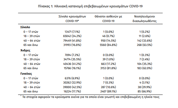 Ο αριθμός των ασθενών που νοσηλεύονται διασωληνωμένοι είναι 422 (69.9% άνδρες). Η διάμεση ηλικία τους είναι 68 έτη. To 84.6% έχει υποκείμενο νόσημα ή/και ηλικία 70 ετών και άνω. Από την αρχή της πανδημίας έχουν εξέλθει από τις ΜΕΘ 1.364 ασθενείς. Οι νέες εισαγωγές2 ασθενών Covid-19 στα νοσοκομεία της επικράτειας είναι 289 (ημερήσια μεταβολή +11.58%). Ο μέσος όρος εισαγωγών του επταημέρου είναι 291 ασθενείς. Hλικιακή κατανομή: Η διάμεση ηλικία των κρουσμάτων είναι 44 έτη (εύρος 0.2 έως 105 έτη), ενώ η διάμεση ηλικία των θανόντων είναι 79 έτη (εύρος 15 έως 103 έτη).