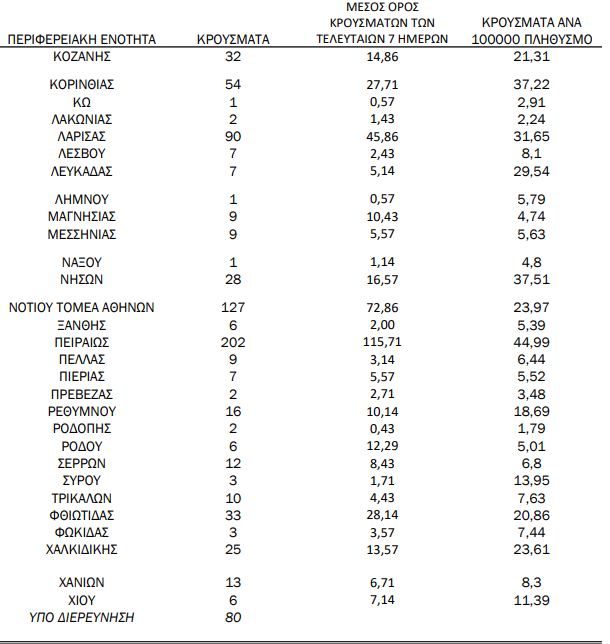 Κατανομή ανακοινωθέντων εγχώριων κρουσμάτων: Από το σύνολο των 2.353 νέων κρουσμάτων του νέου ιού στη χώρα 21 είναι εισαγόμενα εκ των οποίων 18 εντοπίστηκαν κατόπιν ελέγχων στις πύλες εισόδου της χώρας. Η κατανομή των 2.332 νέων εγχώριων κρουσμάτων ανά Περιφερειακή Ενότητα παρουσιάζεται στον κατωτέρω πίνακα.3
