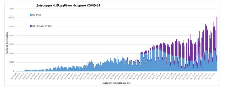 Δείγματα που έχουν ελεγχθεί: Από την 1η Ιανουαρίου 2020 μέχρι σήμερα, στα εργαστήρια που διενεργούν ελέγχους για τον νέο κορωνοϊό (SARS-CoV-2) και που δηλώνουν συστηματικά το σύνολο των δειγμάτων που ελέγχουν, έχουν συνολικά ελεγχθεί 3.687.088 κλινικά δείγματα ενώ από Μονάδες Υγείας και Κλιμάκια του ΕΟΔΥ που διενεργούν ελέγχους Rapid Ag έχουν ελεγχθεί 1.627.965 δείγματα. O μέσος όρος του επταημέρου είναι 43.055 δειγματοληπτικοί έλεγχοι.