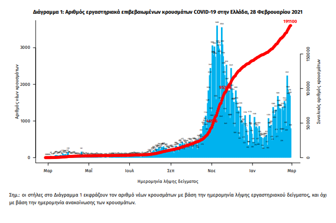 Τα στοιχεία που παρουσιάζονται αφορούν περιστατικά από την επιδημιολογική επιτήρηση της νόσου από το νέο κορωνοϊό (COVID19), με βάση τα δεδομένα που έχουν δηλωθεί στον ΕΟΔΥ και καταγραφεί μέχρι τις 28 Φεβρουαρίου 2021 (ώρα 15:00). Τα νέα εργαστηριακά επιβεβαιωμένα κρούσματα της νόσου που καταγράφηκαν τις τελευταίες 24 ώρες είναι 1.269, εκ των οποίων 1 εντοπίστηκε κατόπιν ελέγχων στις πύλες εισόδου της χώρας. Ο συνολικός αριθμός των κρουσμάτων ανέρχεται σε 191.100 (ημερήσια μεταβολή +0.7%), εκ των οποίων 51.7% άνδρες. Με βάση τα επιβεβαιωμένα κρούσματα των τελευταίων 7 ημερών, 53 θεωρούνται σχετιζόμενα με ταξίδι από το εξωτερικό και 2.671 είναι σχετιζόμενα με ήδη γνωστό κρούσμα. Ημερήσια εξέλιξη της πανδημίας: Η ημερήσια κατανομή των επιβεβαιωμένων κρουσμάτων είναι η ακόλουθη (η γραμμή παριστάνει την συνολική, αθροιστική κατανομή των κρουσμάτων).