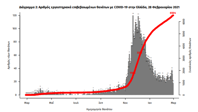 Οι νέοι θάνατοι ασθενών με COVID-19 είναι 36, ενώ από την έναρξη της επιδημίας έχουν καταγραφεί συνολικά 6.504 θάνατοι. Το 95.7% είχε υποκείμενο νόσημα ή/και ηλικία 70 ετών και άνω.