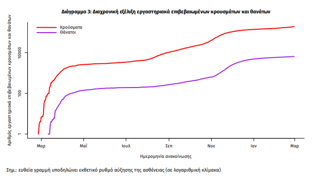 Η διαχρονική εξέλιξη των συνολικών κρουσμάτων και συνολικού αριθμού των θανάτων ασθενών COVID-19 παρουσιάζεται στο ακόλουθο διάγραμμα.
