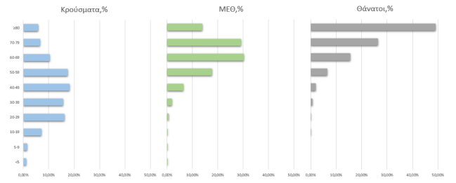 Ακολούθως παρουσιάζεται η ηλικιακή κατανομή των (α) συνολικών κρουσμάτων, (β) των περιστατικών που κατέληξαν σε θάνατο και (γ) των ασθενών που νοσηλεύονται διασωληνωμένοι:
