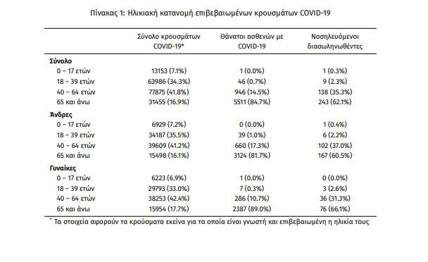 Ο αριθμός των ασθενών που νοσηλεύονται διασωληνωμένοι είναι 391 (70.6% άνδρες). Η διάμεση ηλικία τους είναι 68 έτη. To 84.4% έχει υποκείμενο νόσημα ή/και ηλικία 70 ετών και άνω. Από την αρχή της πανδημίας έχουν εξέλθει από τις ΜΕΘ 1.341 ασθενείς. Οι νέες εισαγωγές1 ασθενών Covid-19 στα νοσοκομεία της επικράτειας είναι 291 (ημερήσια μεταβολή -15.90%). Ο μέσος όρος εισαγωγών του επταημέρου είναι 290 ασθενείς. Hλικιακή κατανομή: Η διάμεση ηλικία των κρουσμάτων είναι 44 έτη (εύρος 0.2 έως 105 έτη), ενώ η διάμεση ηλικία των θανόντων είναι 79 έτη (εύρος 15 έως 103 έτη).