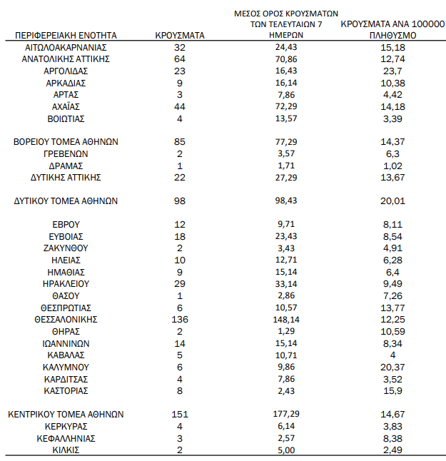 Κατανομή ανακοινωθέντων εγχώριων κρουσμάτων: Από το σύνολο των 1.269 νέων κρουσμάτων του νέου ιού στη χώρα 4 είναι εισαγόμενα εκ των οποίων 1 εντοπίστηκε κατόπιν ελέγχων στις πύλες εισόδου της χώρας. Η κατανομή των 1.265 νέων εγχώριων κρουσμάτων ανά Περιφερειακή Ενότητα παρουσιάζεται στον κατωτέρω πίνακα.2