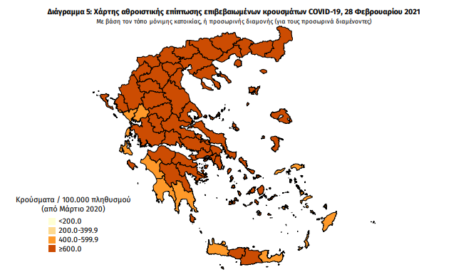 Πίνακας 2: Ημερήσιος αριθμός και κρούσματα ανά 100.000 πληθυσμού επιβεβαιωμένων εγχώριων κρουσμάτων COVID-19 ανά περιφερειακή ενότητα στις 28 Φεβρουαρίου 2021
