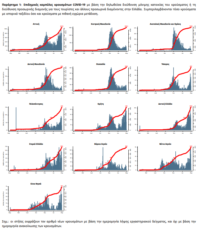 Γεωγραφική διασπορά: Ο χάρτης αποτυπώνει τη γεωγραφική κατανομή των συνολικών κρουσμάτων COVID-19 (από την αρχή της επιδημίας) ανά Περιφερειακή Ενότητα της χώρας, με βάση την δηλωθείσα διεύθυνση μόνιμης κατοικίας του ασθενούς, ή τη διεύθυνση προσωρινής διαμονής για τους τουρίστες και άλλους προσωρινά διαμένοντες στην Ελλάδα. Συμπεριλαμβάνονται τόσο κρούσματα με ιστορικό ταξιδίου (“εισαγόμενα”) όσο και κρούσματα με πιθανή εγχώρια μετάδοση.