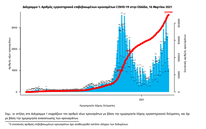 Τα στοιχεία που παρουσιάζονται αφορούν περιστατικά από την επιδημιολογική επιτήρηση της νόσου από το νέο κορωνοϊό (COVID19), με βάση τα δεδομένα που έχουν δηλωθεί στον ΕΟΔΥ και καταγραφεί μέχρι τις 16 Μαρτίου 2021 (ώρα 15:00). Τα νέα εργαστηριακά επιβεβαιωμένα κρούσματα της νόσου που καταγράφηκαν τις τελευταίες 24 ώρες είναι 1.533, εκ των οποίων 27 εντοπίστηκαν κατόπιν ελέγχων στις πύλες εισόδου της χώρας. Ο συνολικός αριθμός των κρουσμάτων ανέρχεται σε 223.789 (ημερήσια μεταβολή +0.7%), εκ των οποίων 51.6% άνδρες. 1 Με βάση τα επιβεβαιωμένα κρούσματα των τελευταίων 7 ημερών, 72 θεωρούνται σχετιζόμενα με ταξίδι από το εξωτερικό και 1.916 είναι σχετιζόμενα με ήδη γνωστό κρούσμα. Ημερήσια εξέλιξη της πανδημίας: Η ημερήσια κατανομή των επιβεβαιωμένων κρουσμάτων είναι η ακόλουθη (η γραμμή παριστάνει την συνολική, αθροιστική κατανομή των κρουσμάτων).