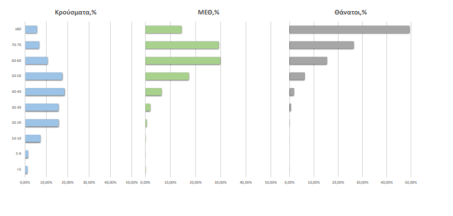 Ακολούθως παρουσιάζεται η ηλικιακή κατανομή των (α) συνολικών κρουσμάτων, (β) των περιστατικών που κατέληξαν σε θάνατο και (γ) των ασθενών που νοσηλεύονται διασωληνωμένοι:
