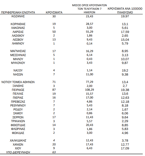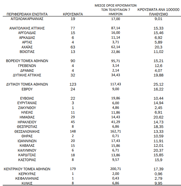 Κατανομή ανακοινωθέντων εγχώριων κρουσμάτων: Από το σύνολο των 1.533 νέων κρουσμάτων του νέου ιού στη χώρα 30 είναι εισαγόμενα εκ των οποίων 27 εντοπίστηκαν κατόπιν ελέγχων στις πύλες εισόδου της χώρας. Η κατανομή των 1.503 νέων εγχώριων κρουσμάτων ανά Περιφερειακή Ενότητα παρουσιάζεται στον κατωτέρω πίνακα.3