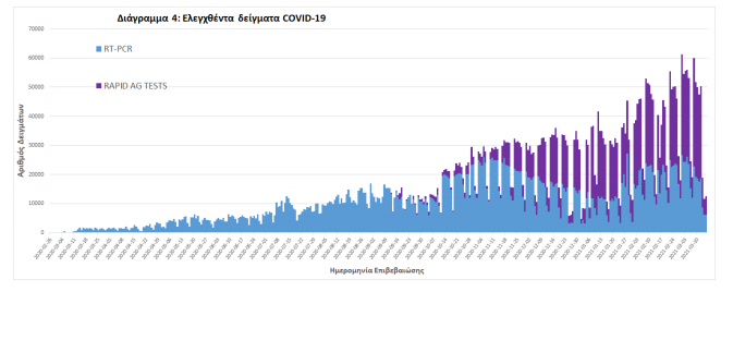 Δείγματα που έχουν ελεγχθεί: Από την 1η Ιανουαρίου 2020 μέχρι σήμερα, στα εργαστήρια που διενεργούν ελέγχους για τον νέο κορωνοϊό (SARS-CoV-2) και που δηλώνουν συστηματικά το σύνολο των δειγμάτων που ελέγχουν, έχουν συνολικά ελεγχθεί 3.931.409 κλινικά δείγματα ενώ από Μονάδες Υγείας και Κλιμάκια του ΕΟΔΥ που διενεργούν ελέγχους Rapid Ag έχουν ελεγχθεί 1.949.382 δείγματα. O μέσος όρος του επταημέρου είναι 34.679 δειγματοληπτικοί έλεγχοι