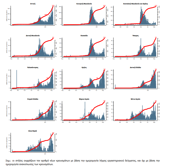 Παράρτημα 1: Επιδημικές καμπύλες κρουσμάτων COVID-19 με βάση την δηλωθείσα διεύθυνση μόνιμης κατοικίας του κρούσματος ή τη διεύθυνση προσωρινής διαμονής για τους τουρίστες και άλλους προσωρινά διαμένοντες στην Ελλάδα. Συμπεριλαμβάνονται τόσο κρούσματα με ιστορικό ταξιδίου όσο και κρούσματα με πιθανή εγχώρια μετάδοση.