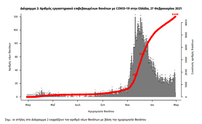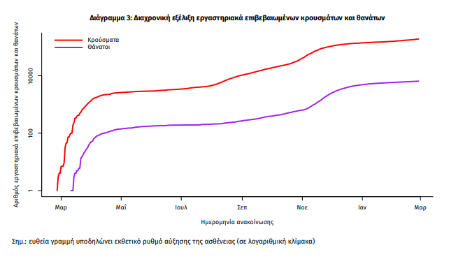 Η διαχρονική εξέλιξη των συνολικών κρουσμάτων και συνολικού αριθμού των θανάτων ασθενών COVID-19 παρουσιάζεται στο ακόλουθο διάγραμμα.