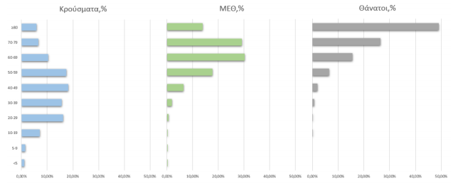 Ακολούθως παρουσιάζεται η ηλικιακή κατανομή των (α) συνολικών κρουσμάτων, (β) των περιστατικών που κατέληξαν σε θάνατο και (γ) των ασθενών που νοσηλεύονται διασωληνωμένοι: