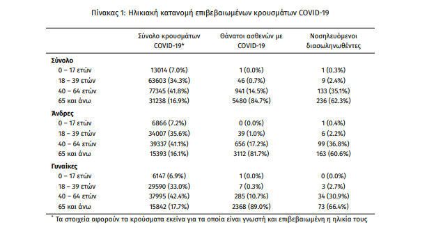 Ο αριθμός των ασθενών που νοσηλεύονται διασωληνωμένοι είναι 379 (71.0% άνδρες). Η διάμεση ηλικία τους είναι 68 έτη. To 84.2% έχει υποκείμενο νόσημα ή/και ηλικία 70 ετών και άνω. Από την αρχή της πανδημίας έχουν εξέλθει από τις ΜΕΘ 1.338 ασθενείς. Οι νέες εισαγωγές1 ασθενών Covid-19 στα νοσοκομεία της επικράτειας είναι 346 (ημερήσια μεταβολή +28.15%). Ο μέσος όρος εισαγωγών του επταημέρου είναι 285 ασθενείς. Hλικιακή κατανομή: Η διάμεση ηλικία των κρουσμάτων είναι 44 έτη (εύρος 0.2 έως 105 έτη), ενώ η διάμεση ηλικία των θανόντων είναι 79 έτη (εύρος 15 έως 103 έτη).