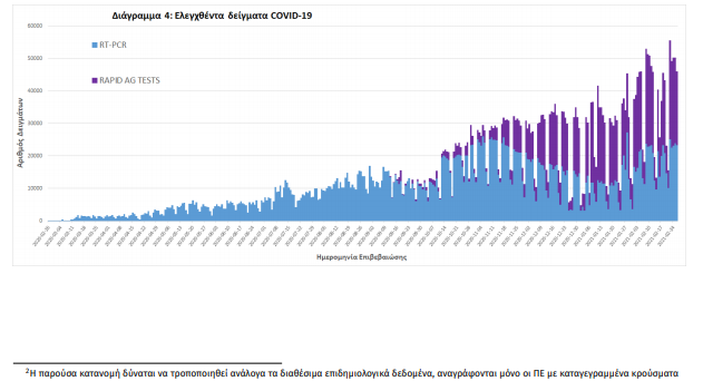 Δείγματα που έχουν ελεγχθεί: Από την 1η Ιανουαρίου 2020 μέχρι σήμερα, στα εργαστήρια που διενεργούν ελέγχους για τον νέο κορωνοϊό (SARS-CoV-2) και που δηλώνουν συστηματικά το σύνολο των δειγμάτων που ελέγχουν, έχουν συνολικά ελεγχθεί 3.631.831 κλινικά δείγματα ενώ από Μονάδες Υγείας και Κλιμάκια του ΕΟΔΥ που διενεργούν ελέγχους Rapid Ag έχουν ελεγχθεί 1.577.701 δείγματα. O μέσος όρος του επταημέρου είναι 41.450 δειγματοληπτικοί έλεγχοι.