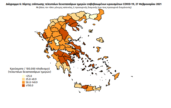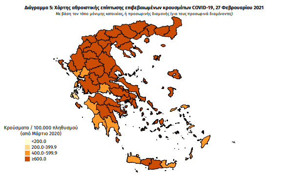Πίνακας 2: Ημερήσιος αριθμός και κρούσματα ανά 100.000 πληθυσμού επιβεβαιωμένων εγχώριων κρουσμάτων COVID-19 ανά περιφερειακή ενότητα στις 27 Φεβρουαρίου 2021