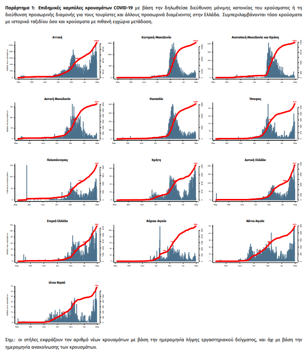 Γεωγραφική διασπορά: Ο χάρτης αποτυπώνει τη γεωγραφική κατανομή των συνολικών κρουσμάτων COVID-19 (από την αρχή της επιδημίας) ανά Περιφερειακή Ενότητα της χώρας, με βάση την δηλωθείσα διεύθυνση μόνιμης κατοικίας του ασθενούς, ή τη διεύθυνση προσωρινής διαμονής για τους τουρίστες και άλλους προσωρινά διαμένοντες στην Ελλάδα. Συμπεριλαμβάνονται τόσο κρούσματα με ιστορικό ταξιδίου (“εισαγόμενα”) όσο και κρούσματα με πιθανή εγχώρια μετάδοση.