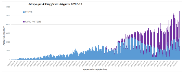 Δείγματα που έχουν ελεγχθεί: Από την 1η Ιανουαρίου 2020 μέχρι σήμερα, στα εργαστήρια που διενεργούν ελέγχους για τον νέο κορωνοϊό (SARS-CoV-2) και που δηλώνουν συστηματικά το σύνολο των δειγμάτων που ελέγχουν, έχουν συνολικά ελεγχθεί 3.538.932 κλινικά δείγματα ενώ από Μονάδες Υγείας και Κλιμάκια του ΕΟΔΥ που διενεργούν ελέγχους Rapid Ag έχουν ελεγχθεί 1.474.739 δείγματα. O μέσος όρος του επταημέρου είναι 35.141 δειγματοληπτικοί έλεγχοι.