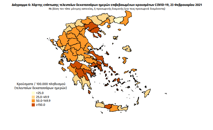 Πίνακας 2: Ημερήσιος αριθμός και κρούσματα ανά 100.000 πληθυσμού επιβεβαιωμένων εγχώριων κρουσμάτων COVID-19 ανά περιφερειακή ενότητα στις 23 Φεβρουαρίου 2021