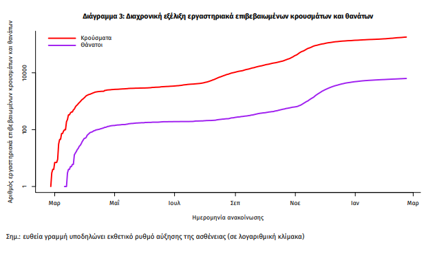 Η διαχρονική εξέλιξη των συνολικών κρουσμάτων και συνολικού αριθμού των θανάτων ασθενών COVID-19 παρουσιάζεται στο ακόλουθο διάγραμμα.