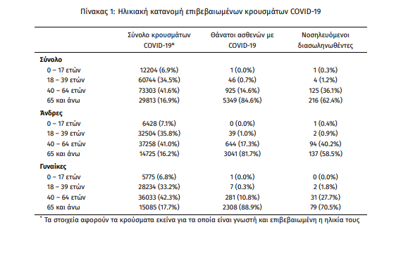 Ο αριθμός των ασθενών που νοσηλεύονται διασωληνωμένοι είναι 346 (67.3% άνδρες). Η διάμεση ηλικία τους είναι 68 έτη. To 85.5% έχει υποκείμενο νόσημα ή/και ηλικία 70 ετών και άνω. Από την αρχή της πανδημίας έχουν εξέλθει από τις ΜΕΘ 1.280 ασθενείς. Οι νέες εισαγωγές2 ασθενών Covid-19 στα νοσοκομεία της επικράτειας είναι 264 (ημερήσια μεταβολή +1.93%). Ο μέσος όρος εισαγωγών του επταημέρου είναι 233 ασθενείς. Hλικιακή κατανομή:Η διάμεση ηλικία των κρουσμάτων είναι 44 έτη (εύρος 0.2 έως 105 έτη), ενώ η διάμεση ηλικία των θανόντων είναι 79 έτη (εύρος 15 έως 103 έτη).